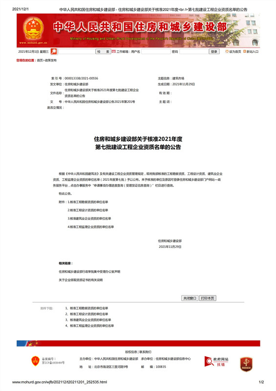 12月1日,中华人民共和国住房和城乡建设部发布《住房和城乡建设部关于核准2021年度第七批建设工程企业资质名单的公告》(2021年第201号),公布了核准设计资质的单位名单,我公司榜上有名,天行体育登录入口顺利取得了建筑行业(建筑工程)甲级资质。